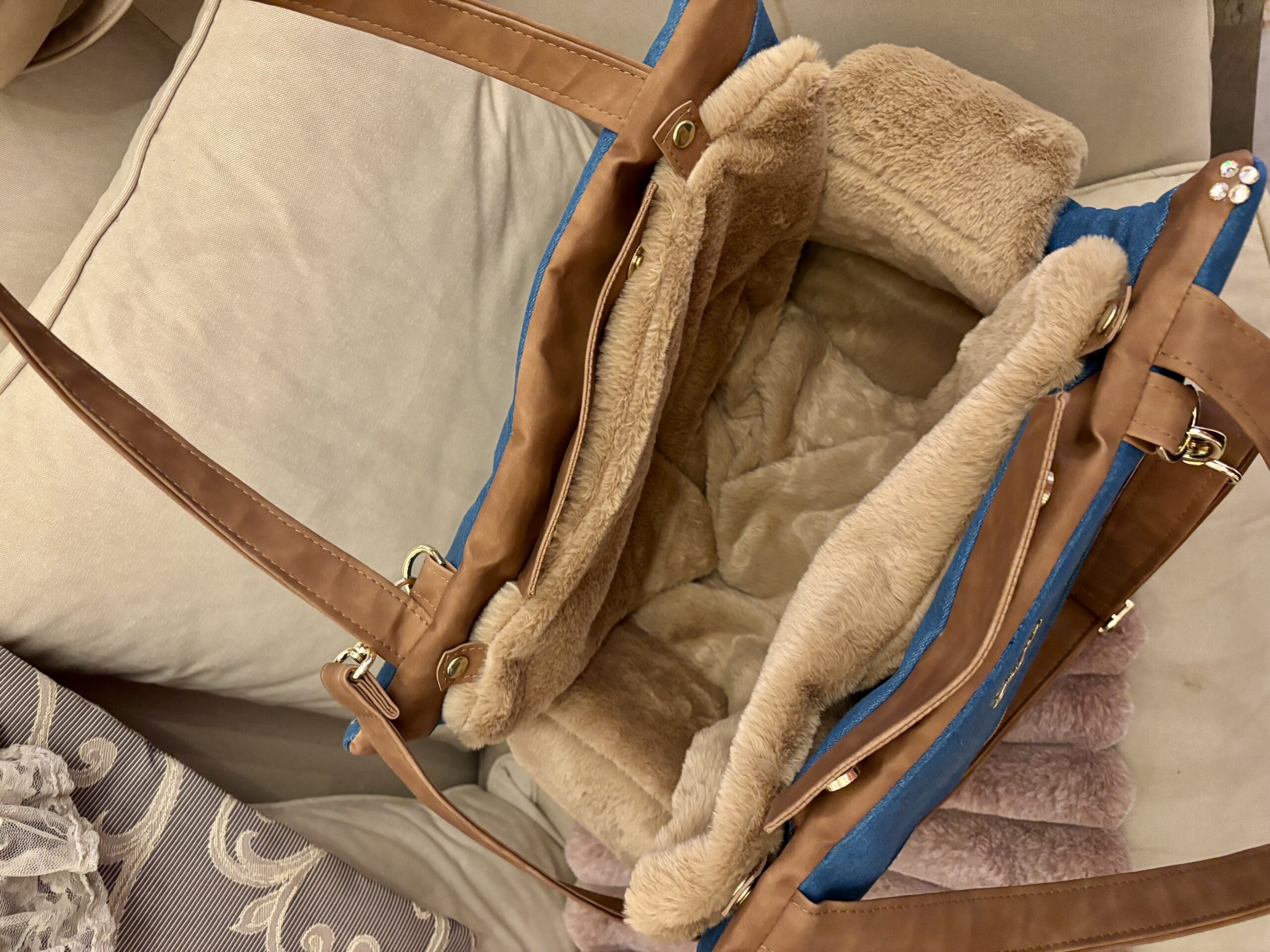 Sac « Glamorous » multi saisons en coton et simili cuir, très confortable, pratique pour toutes les saisons grâce son intérieur en fausse fourrure et coton amovible et réversible.