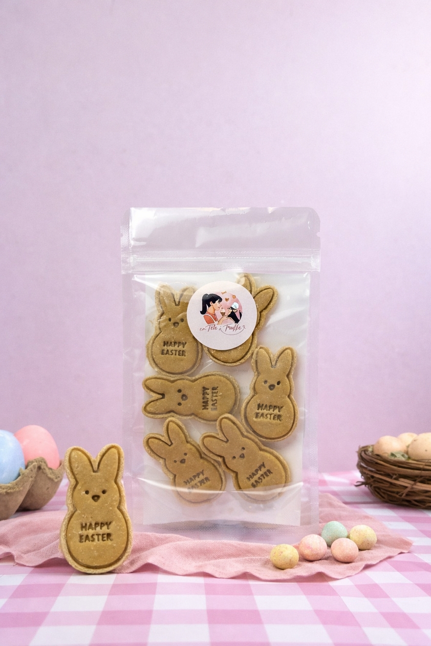 En tête à truffe – Sachet de biscuits de Pâques pour chien Lapins « Happy Easter »