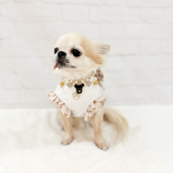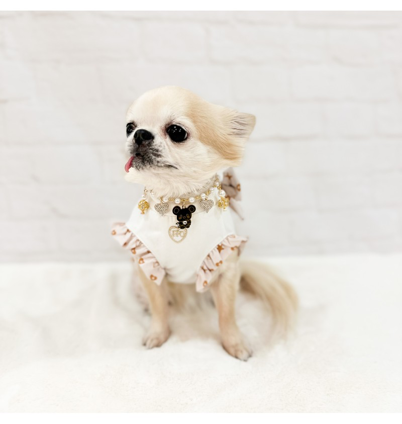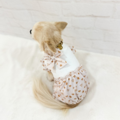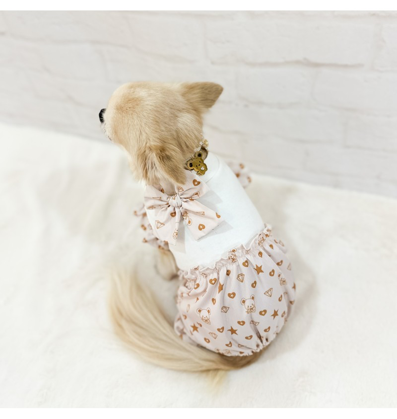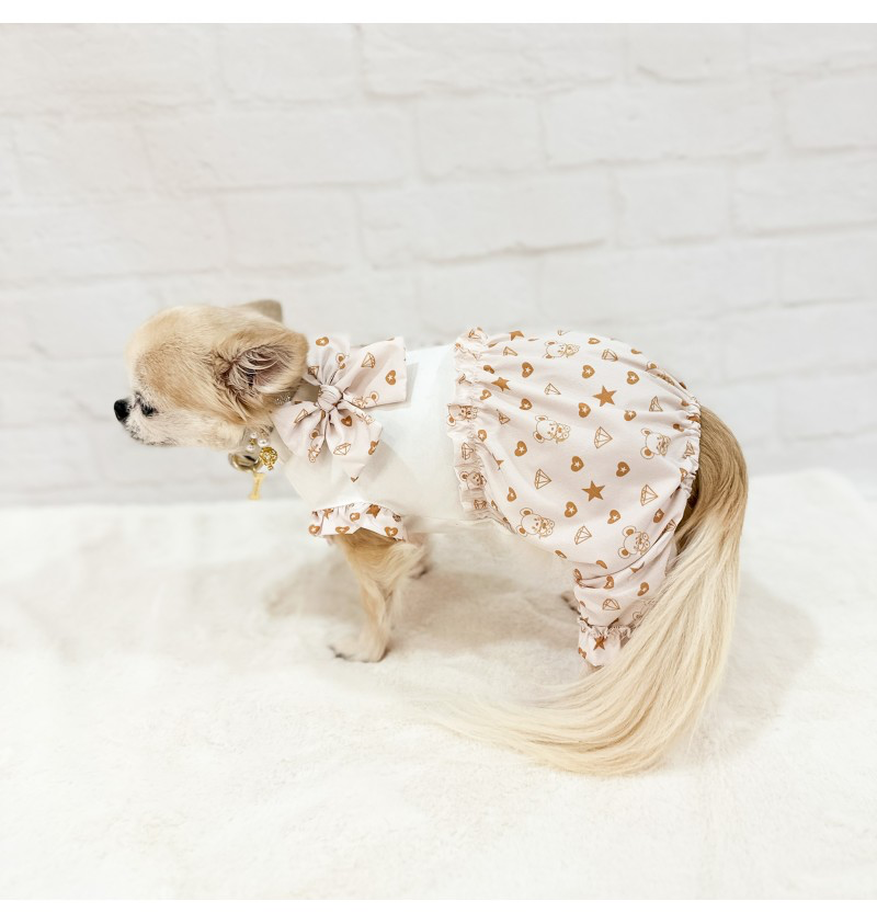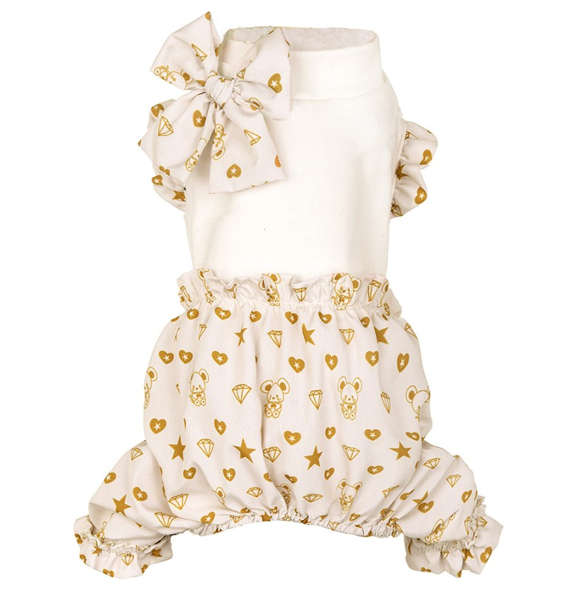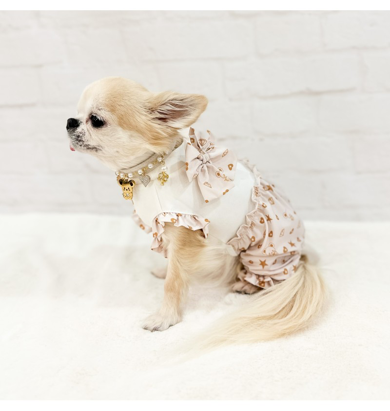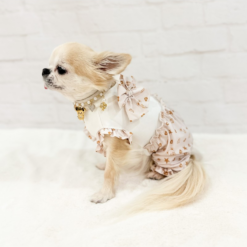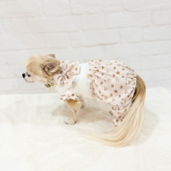 Combinaison printemps/été pour chien confectionnée dans le tissu exclusif Topomio Monogram Golden, symbole d’élégance et d’identité unique.
